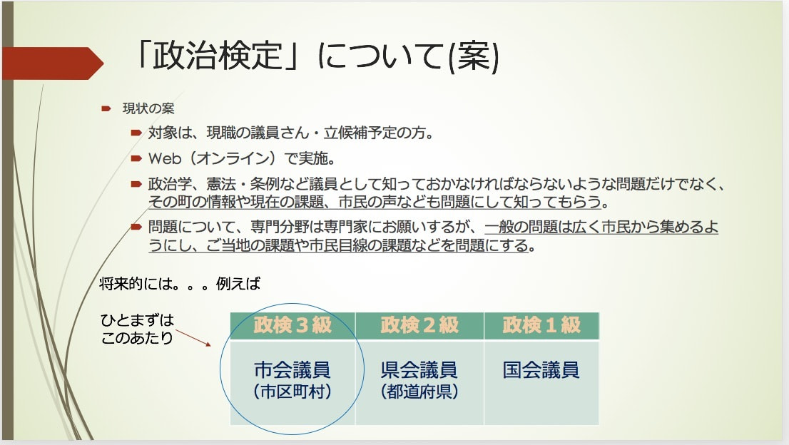 そこで議員と市民をつなぐために、政治検定を考えました。