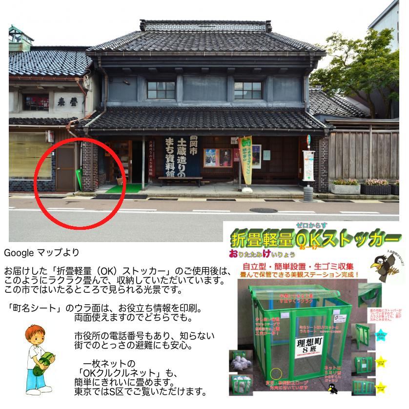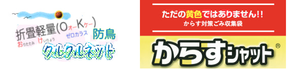 グッドデザイン賞一次審査合格。簡単便に折り畳める「カラスネット」はお任せください。また「折畳軽量(OK)ストッカー」に合わせた「町名表示板」も好評です。黄色のゴミ袋「からすシャット」も一ケース単位でご注文いただけます。